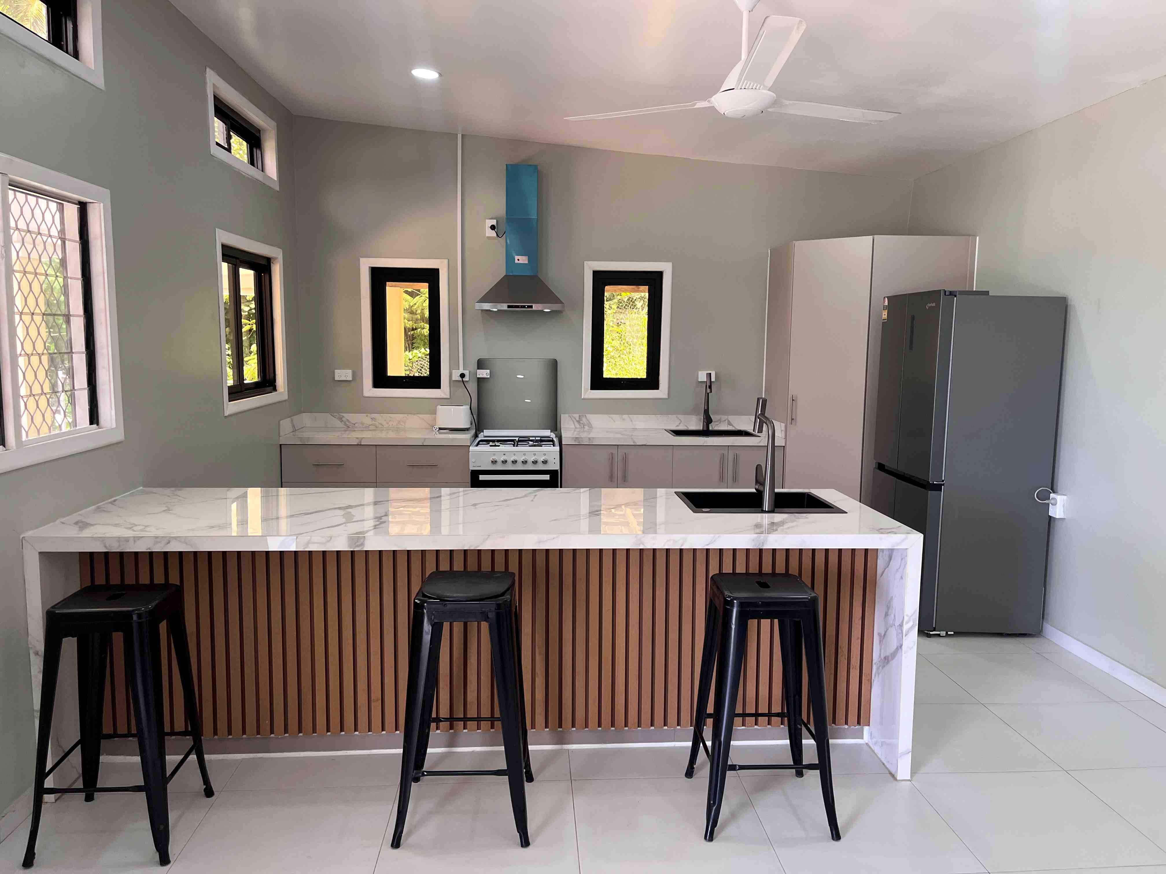Brand new brick and tile construction, three spacious bedrooms, master bedroom with private ensuite, open plan kitchen and dining areas with mountain views, modern granite kitchen with quality appliances, full air conditioning with ceiling fans, covered front veranda ideal for relaxing, secure gated entry with private concrete driveway, and a carport with laundry and additional toilet.